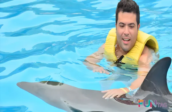2. غواصی با دلفین شامل حرکات در سطح و عمق آب استخر با دلفین ها که تمام مدت کنار دلفین خواهید بود.
